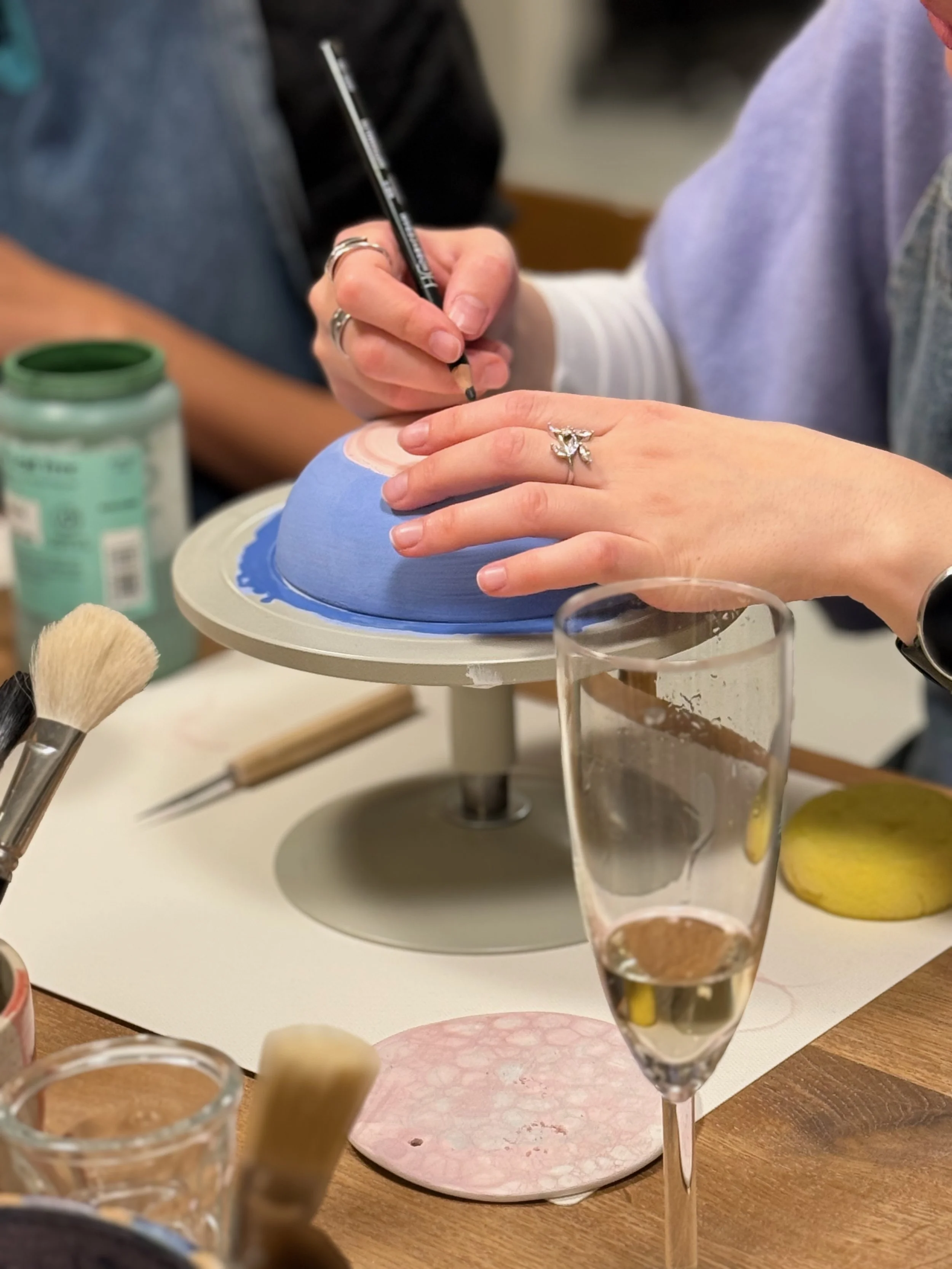 Bei Pottery, Paint & Bubbles im Atelier Alfar gestaltest du dein eigenes Keramikstück in entspannter Atmosphäre – begleitet von guten Gesprächen und einem Glas Wein oder Prosecco.